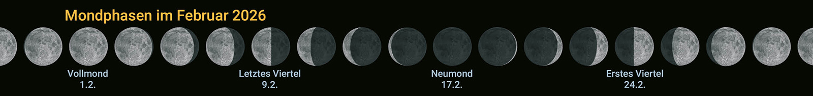 Merkur ist Mitte Februar am Abendhimmel zu sehen. Am 19. Februar erreicht er seine größte östliche Elongation. Südlich von Merkur taucht auch Venus wieder auf. Am 18. steht unterhalb von Merkur die schmale Mondsichel, am 19. oberhalb von Merkur neben Saturn.