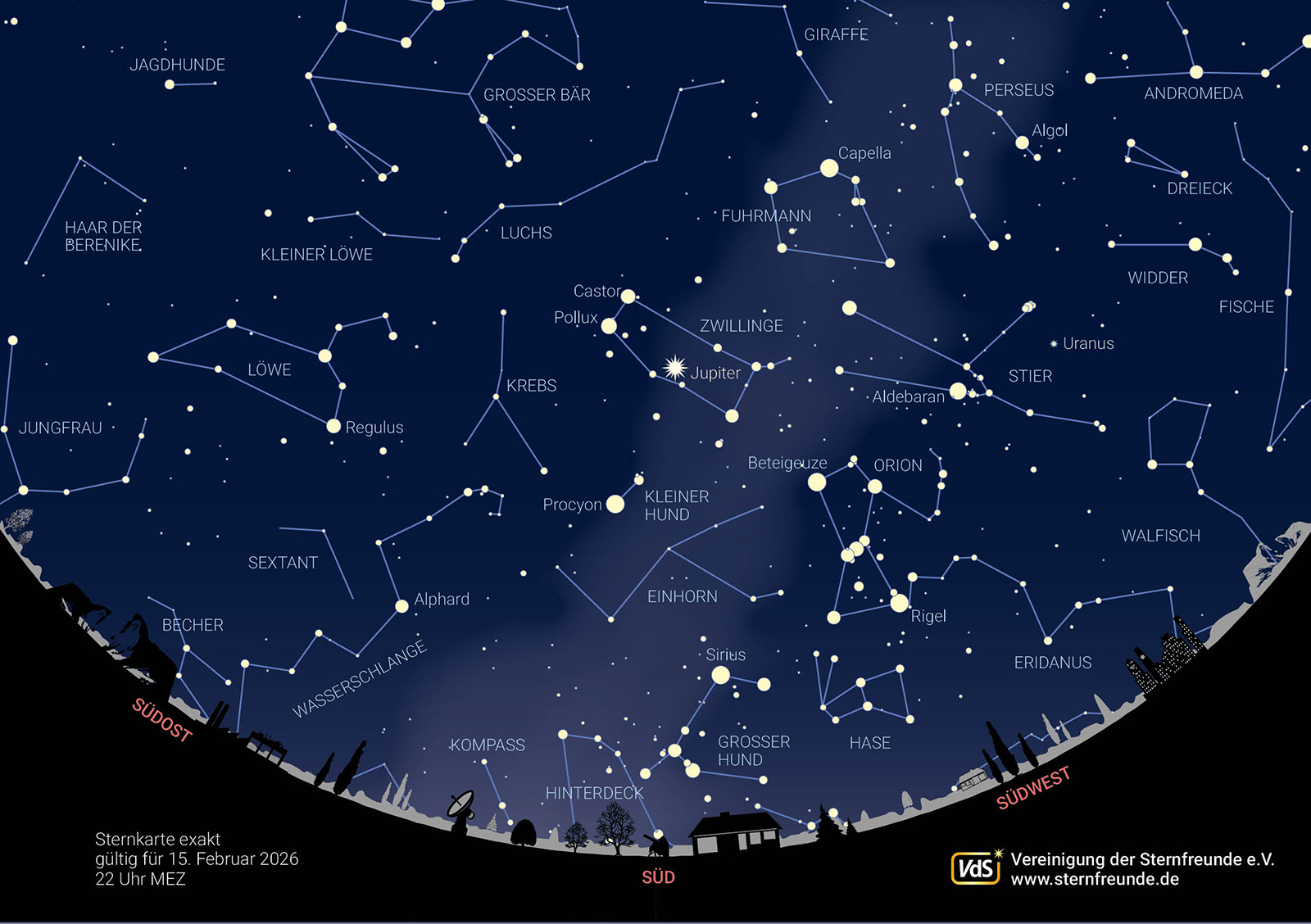 In den Abendstunden des Februar funkelt der Sternenhimmel ordentlich: Die Wintersternbilder rund um den Himmelsjäger Orion sind berühmt für ihre hellen Sterne. Um 22 Uhr (diesen Anblick zeigt die Sternkarte) sind diese Sternbilder bereits über den Meridian gezogen. Unter dem Orion flackert mit Sirius im Großen Hund der hellste Stern des gesamten Himmels. Über dem Orion findet man rechts den Stier mit seinem Hauptstern Aldebaran, noch höher am Himmel den Fuhrmann mit der gelblichen Capella und links oberhalb des Orion die Zwillinge mit den beiden hellen Sternen Castor und Pollux. Unterhalb der Zwillinge leuchtet mit Prokyon der hellste Stern im Kleinen Hund.