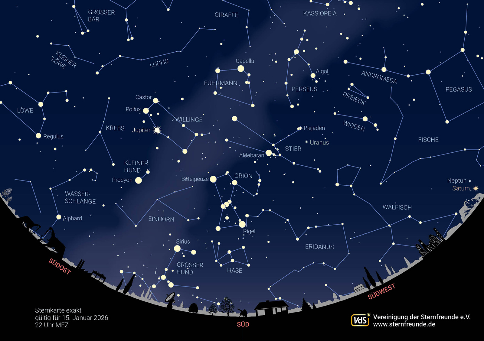 Auf der Januar-Sternkarte – sie gilt für 22 Uhr – erkennt man in Südrichtung das bekannteste Wintersternbild, den Orion. Seine sieben Sterne sind alle sehr hell. In der von ihnen aufgespannten Form kann man sich gut den menschlichen Körper des Himmelsjägers vorstellen. Unterhalb der drei „Gürtelsterne“ entdeckt man mit einem Fernglas den blass schimmernden Orion-Nebel. Der rechte untere Stern des Orion, Rigel, ist gleichzeitig die rechte untere Ecke des Wintersechsecks. Beim Wintersechseck handelt es sich um kein Sternbild, sondern um eine große Figur aus sechs hellen Sternen verschiedener Sternbilder. Im Uhrzeigersinn folgt auf Rigel im Orion zuerst Sirius (im Großen Hund), dann Procyon (im Kleinen Hund), Castor (in den Zwillingen), Capella (im Fuhrmann), und schließlich Aldebaran im Stier.
